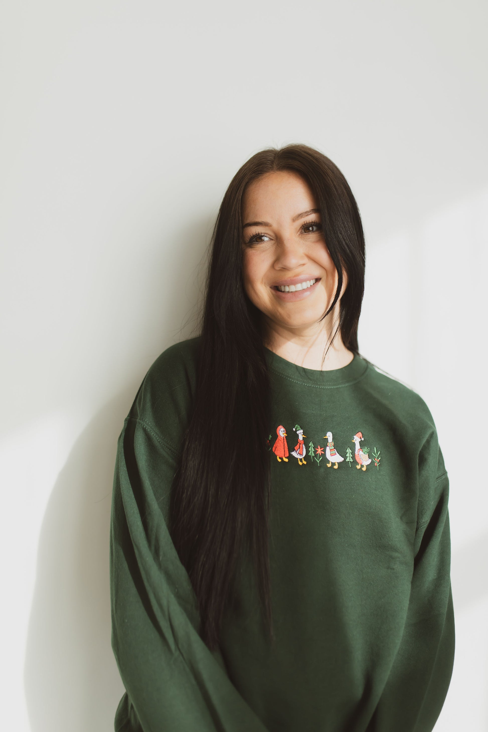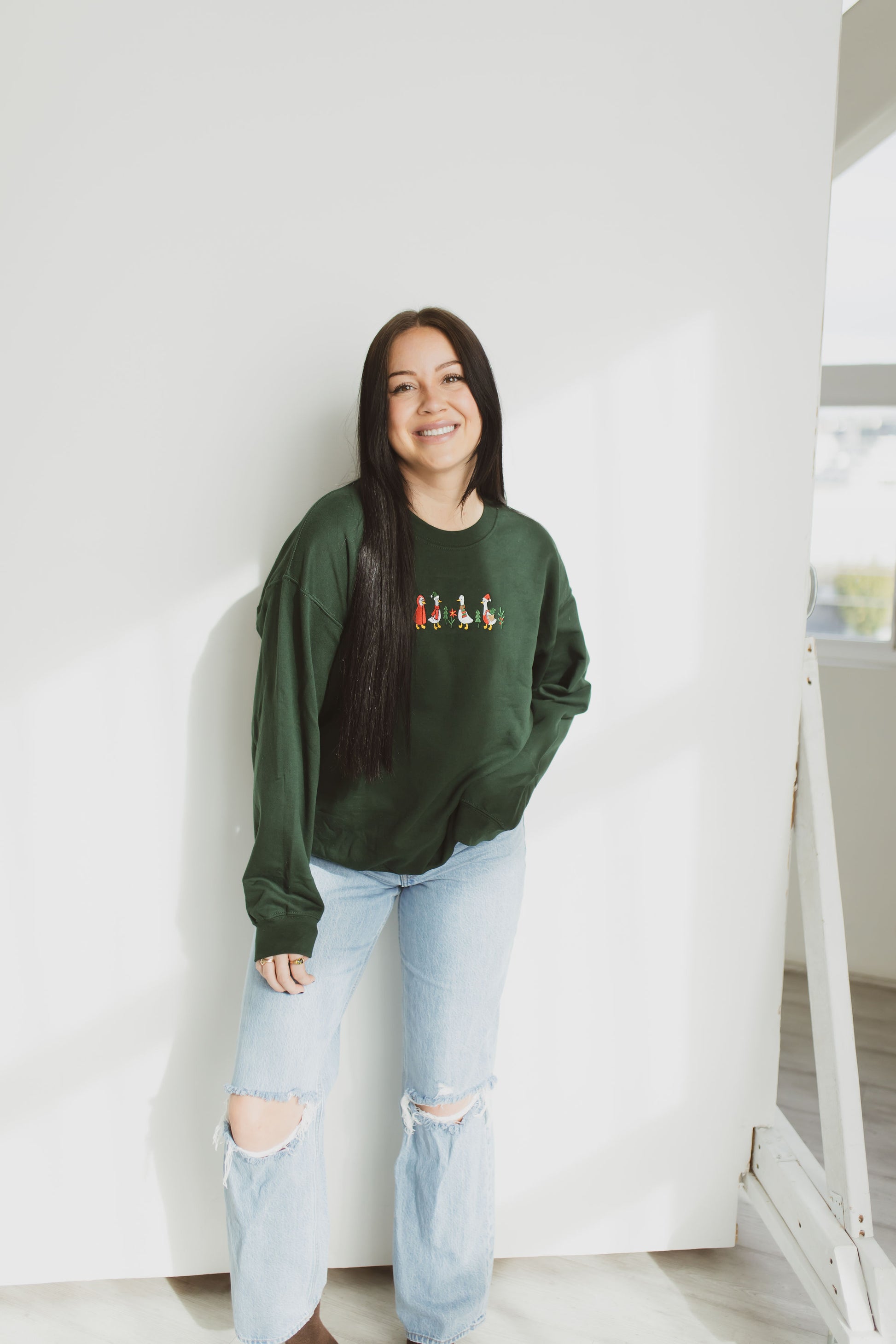 This cozy embroidered crewneck features merry geese dressed for holiday mischief! With its soft fabric and relaxed fit, it’s perfect for tree decorating, cocoa sipping, or pretending you didn’t just watch your favorite Christmas movie for the tenth time. Pairs perfectly with leggings, jeans, and an unreasonable amount of twinkle lights. 🦢🎅🎄